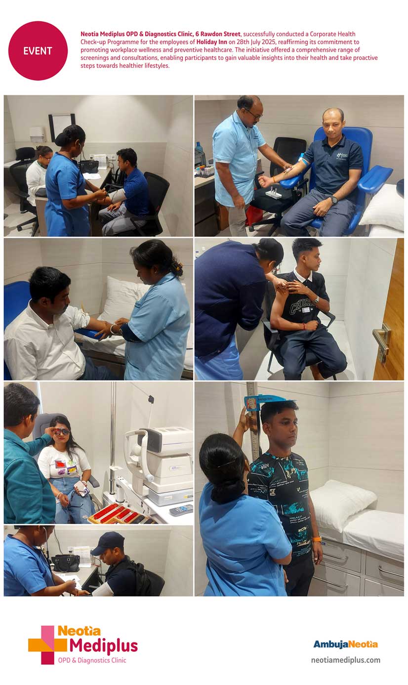 Neotia Mediplus OPD & Diagnostics Clinic, 6 Rawdon Street, successfully conducted a Corporate Health Check-up Programme for the employees of Holiday Inn, reaffirming its commitment to promoting workplace wellness and preventive healthcare. The initiative offered a comprehensive range of screenings and consultations, enabling participants to gain valuable insights into their health and take proactive steps towards healthier lifestyles.